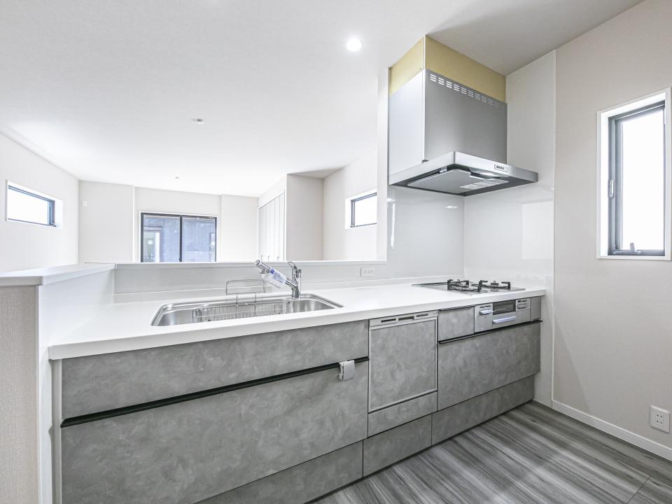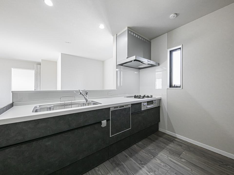 空間の印象を引き締めるダークカラーのシステムキッチンを採用。食後の家事をサポートする食器洗浄乾燥機付きです。