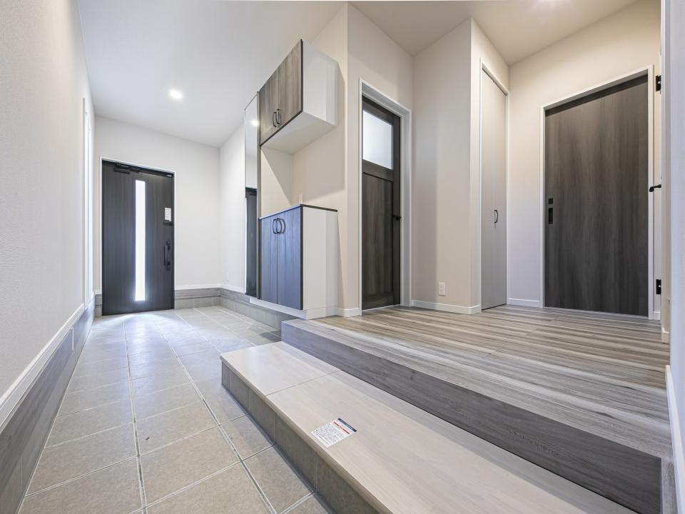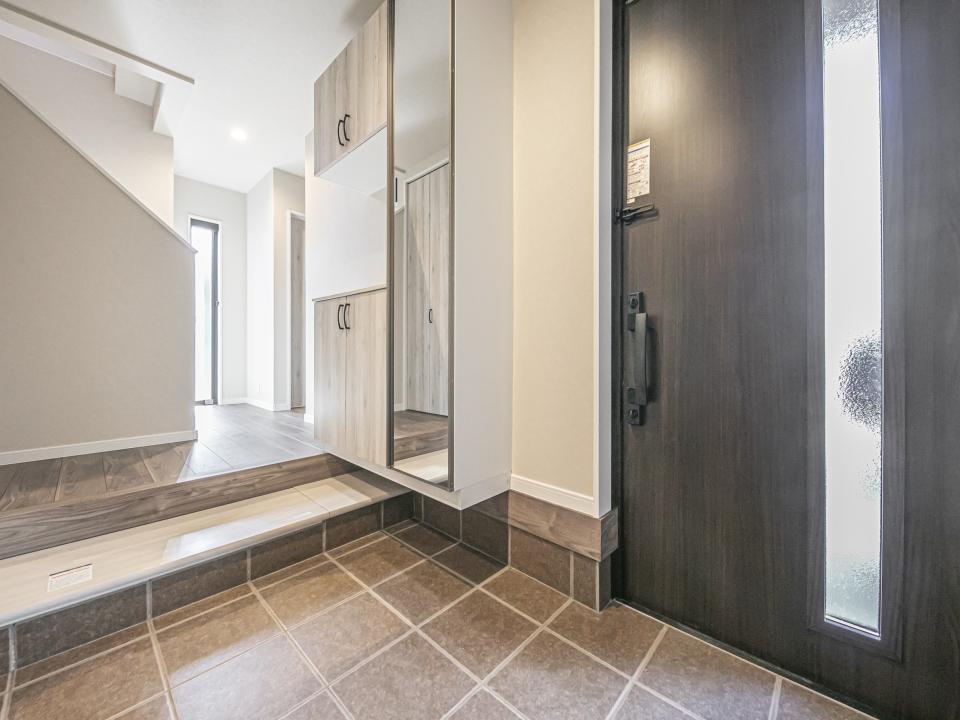 ご家族やゲストを迎える、広々とした明るい玄関。シューズボックスの他、可動棚付きの収納を備え、すっきりとした空間を保つことができます!