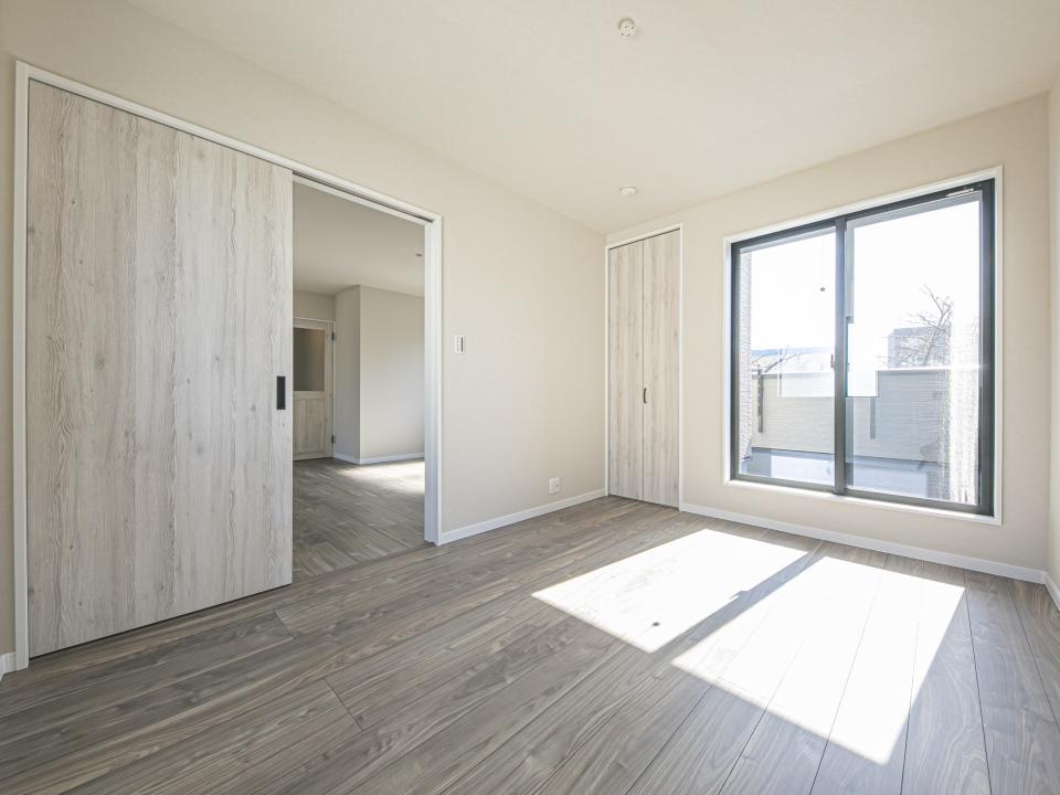 リビングに隣接した洋室です。南向きバルコニーを備え、明るい陽光が差し込みます。衣類をしまえるクローゼット付きです!