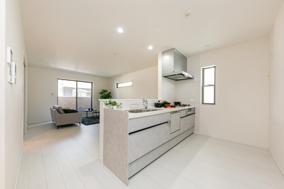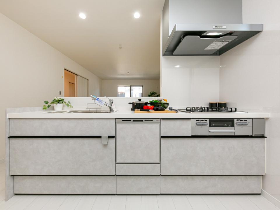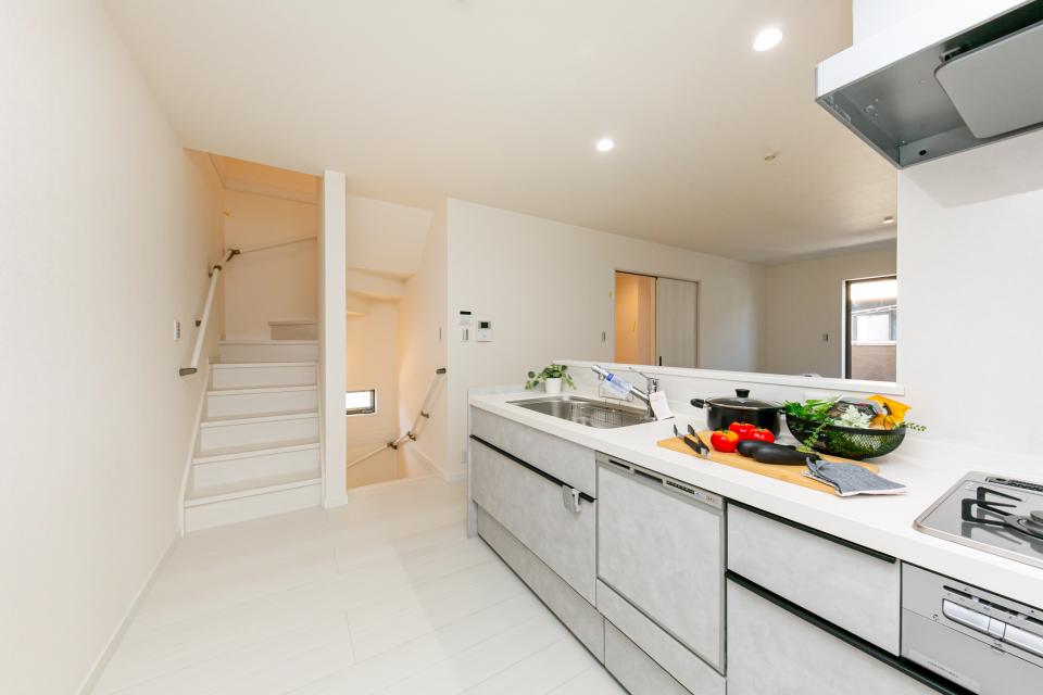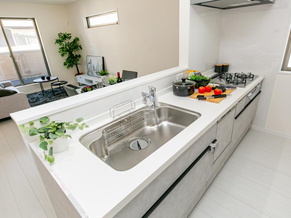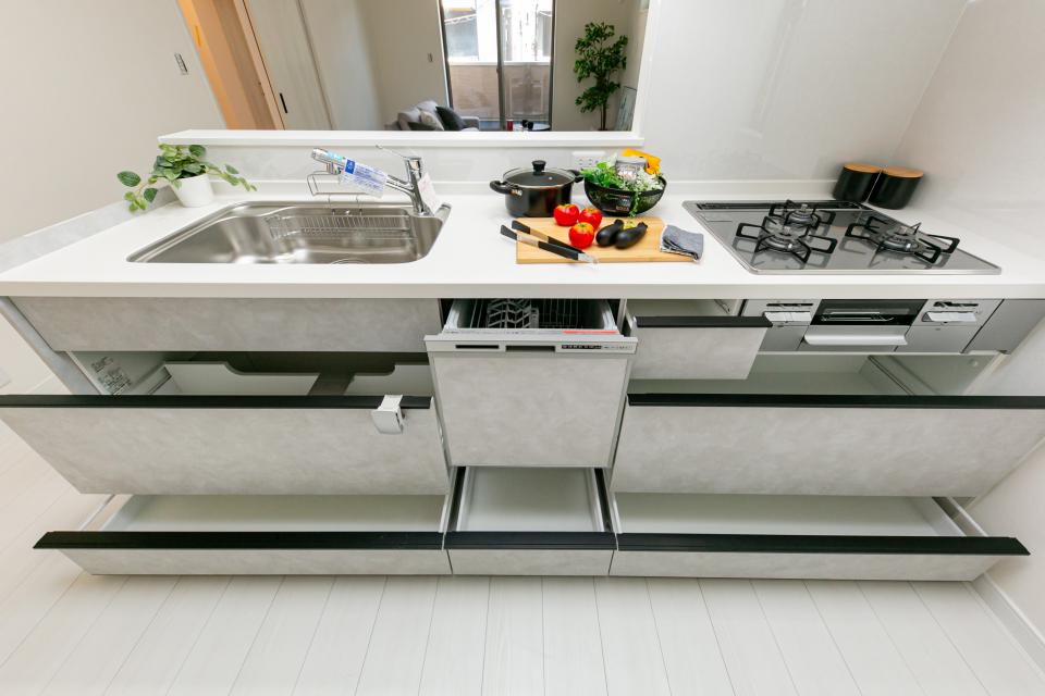 キッチンには浄水器一体型水栓や、食器洗浄乾燥機、大容量のスライド式収納など、快適な家事をアシストする設備が標準仕様。