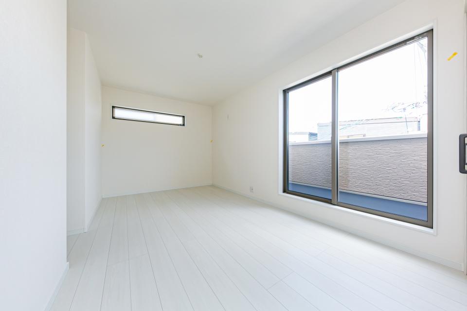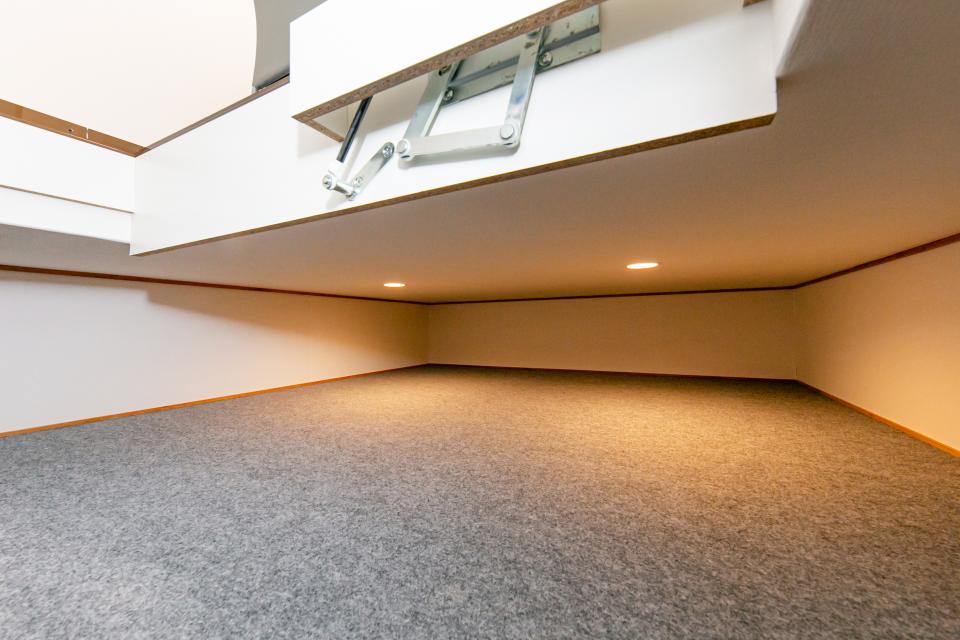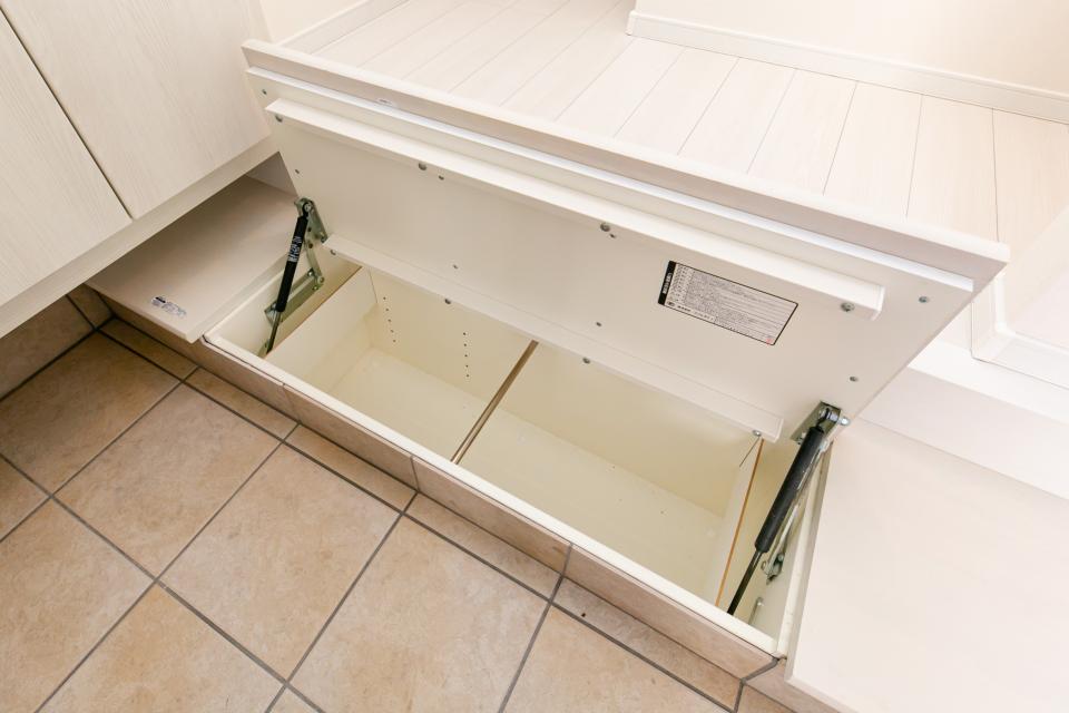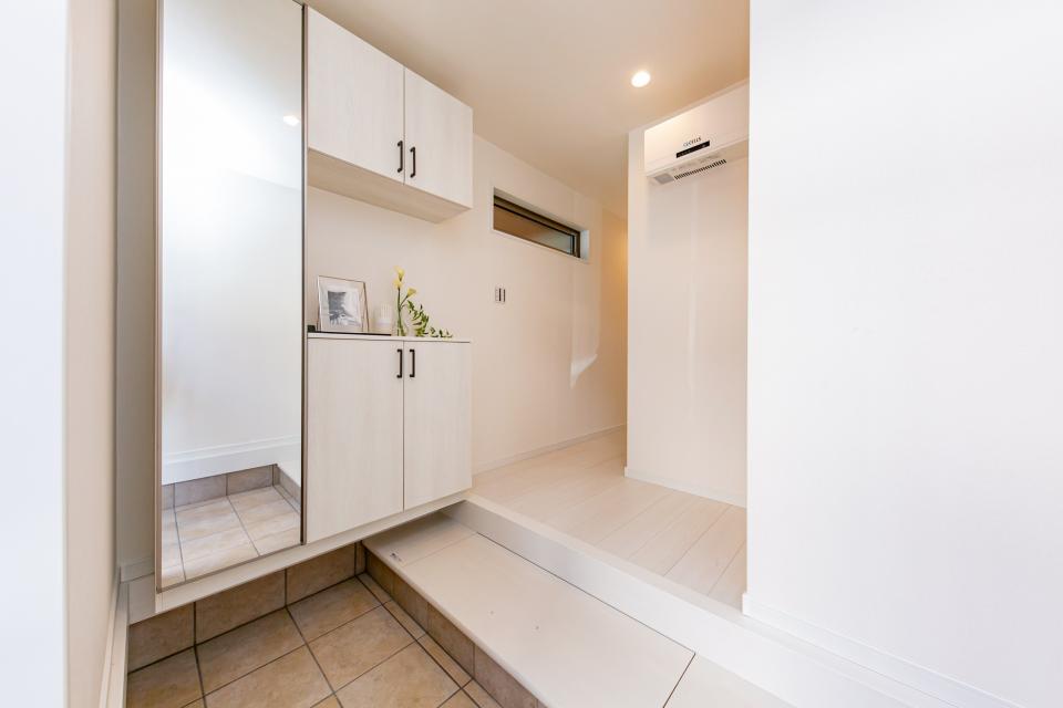 2階に広々としたランドリースペースを配置。LDKのすぐ隣に位置するため、お料理や片付けと並行して、スムーズにお洗濯に取り掛かれます。十分な広さを確保した空間は、花粉の季節や雨天時の室内干しにも最適。乾いたお洗濯は、扉付きの収納にキレイに収めましょう。中には可動式の棚が付いているので、自由にアレンジして、タオルや洗剤のストックなどを整理整頓できます。