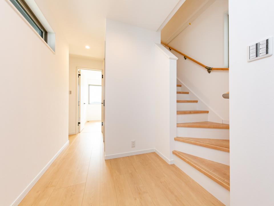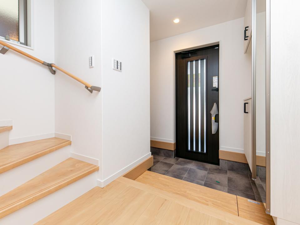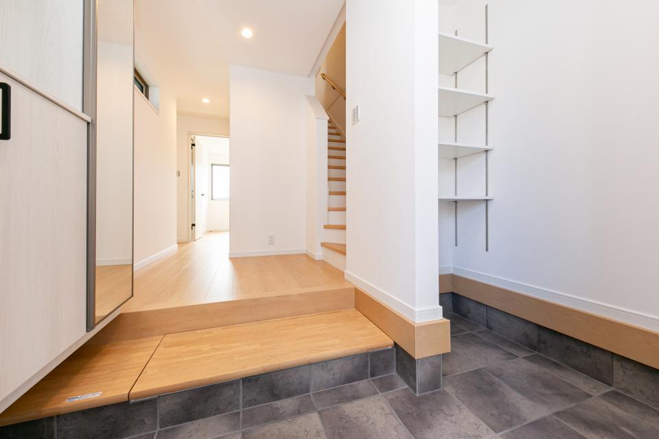 玄関にはシューズインクローゼットと靴箱があり、靴だけでなく外で使う道具を、まるごと玄関で管理。大型でかさばるお荷物は、1階洋室の床下収納庫へ。ひんぱんに使わないアウトドアグッズなどの保管に便利です。